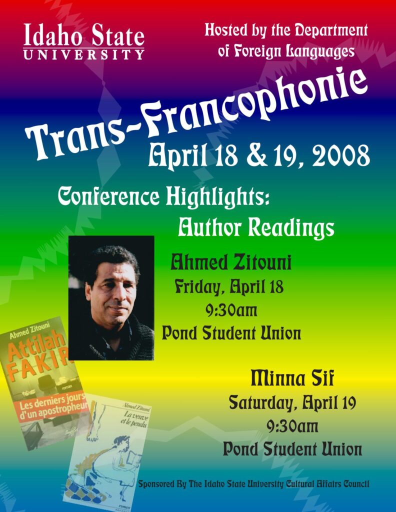 Colloque : « Trans-Francophonie », Université de l’État d’Idaho, Pocatello, USA, avril 2008. Cette conférence a dû être annulée pour des raisons de santé.
