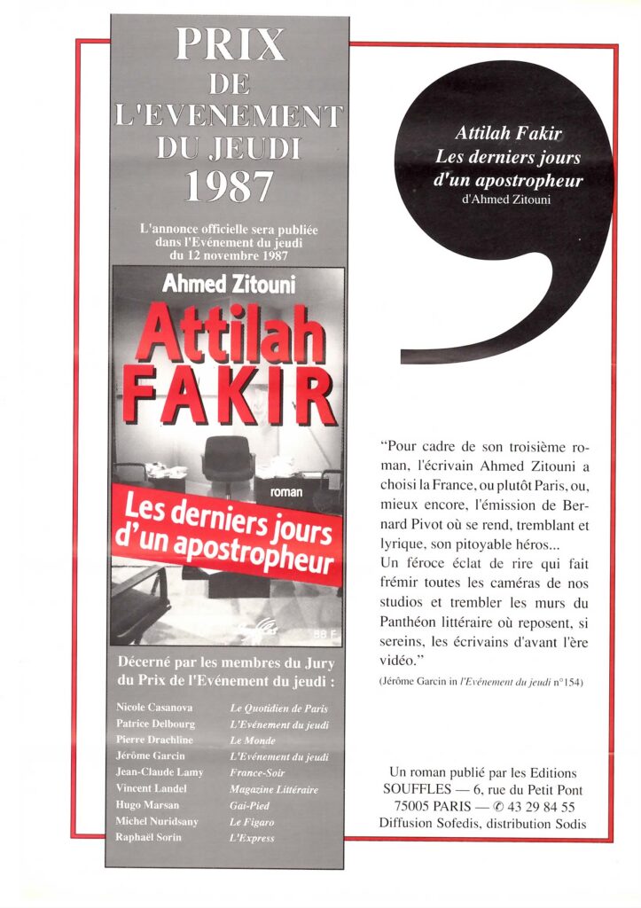 Attilah Fakir (Les derniers jours d’un apostropheur), Éd. Souffles, Paris, 1987